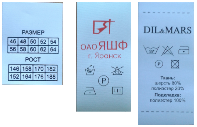 Бирка (ярлык, этикетка) вшивная – это, способ маркировки тканевых изделий. Бирка или ярлык прикрепляется к изделию путем закрепления в шов. Такой неотрывный ярлык можно найти на всех без исключения швейных изделиях. Основная задача такой маркировки – предоставление покупателю информации о характеристиках изделия , производителе, составе, размере и т.д..
